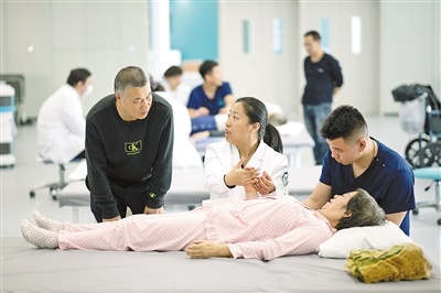 医生指导家属辅助按摩护理。